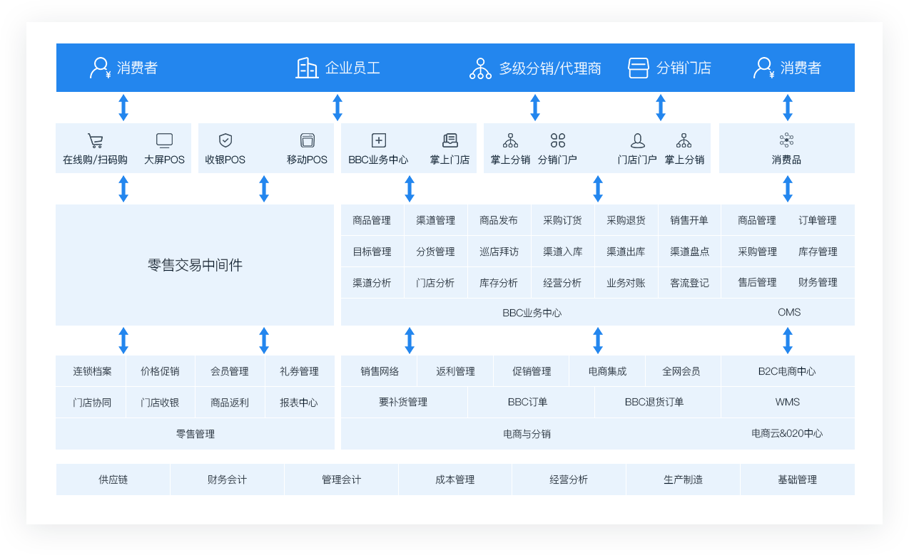 通過敏捷前臺、共享中臺、多元后臺,打通全渠道數(shù)據(jù)和營銷業(yè)務,實現(xiàn)全網(wǎng)訂單統(tǒng)一管理,全局庫存統(tǒng)一分配,全網(wǎng)會員精準營銷,以及業(yè)財融合的一體化解決方案